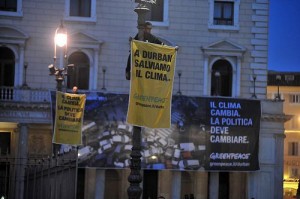 L’appello continua su altri manifesti. “A Durban salviamo il clima”, è il messaggio indirizzato dagli attivisti dell’associazione ambientalista al nuovo governo, e in particolare al Ministro dell’Ambiente Corrado Clini, che oggi rappresenterà l’Italia alla Conferenza delle Nazioni Unite sul clima, in Sudafrica. Contemporaneamente al sit-in di fronte a Palazzo Chigi, due attori, vestiti e truccati come se fossero in un film in bianco e nero, hanno messo in scena una rappresentazione della politica, insensibile al problema dei cambiamenti climatici.